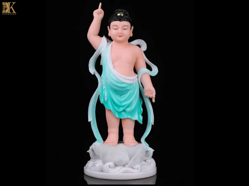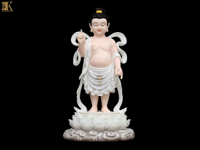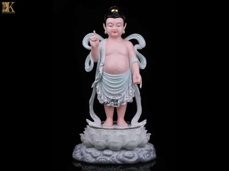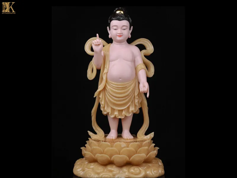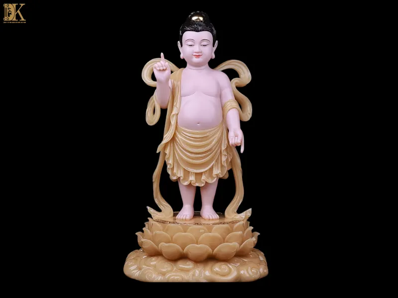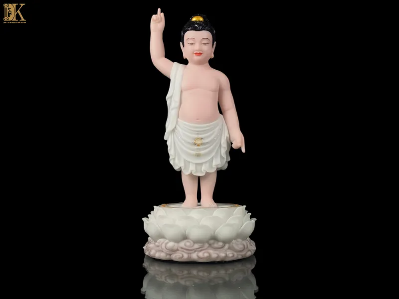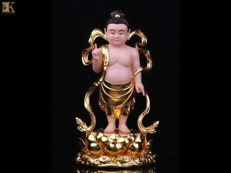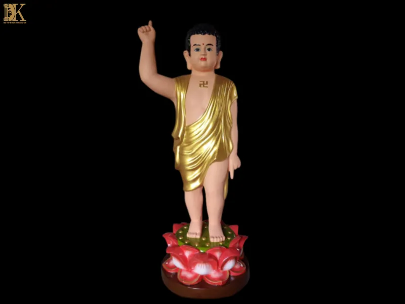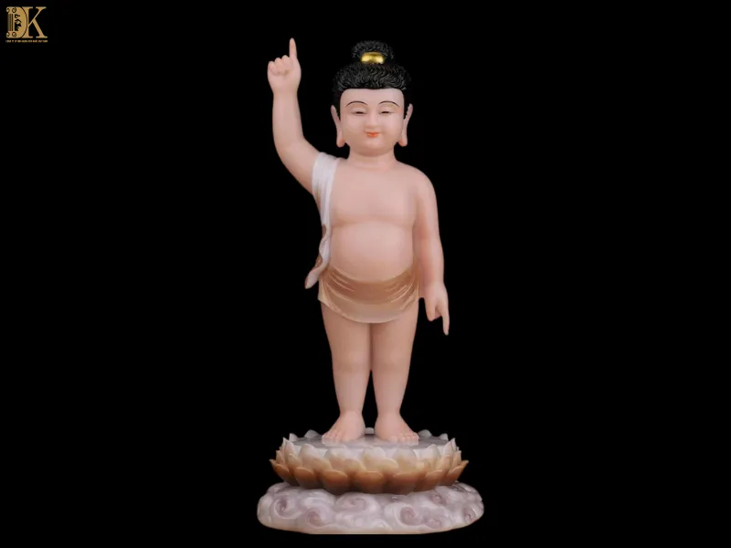 Hình tượng Phật Đản Sanh thường được thể hiện qua tượng em bé Phật đứng trên đài sen, một tay chỉ trời, một tay chỉ đất – là biểu tượng của ánh sáng trí tuệ và sự giác ngộ.