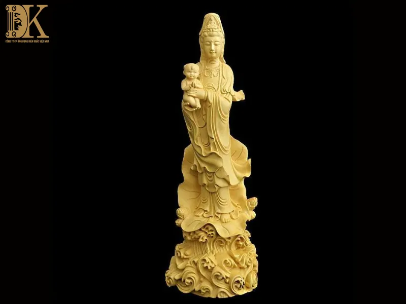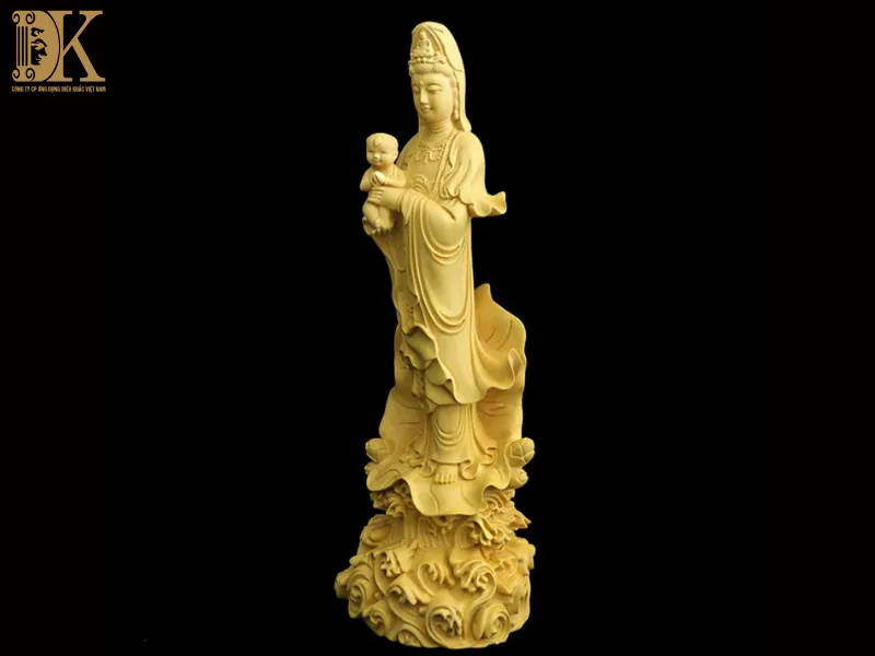 Quan Âm tay bồng một em bé, biểu cảm từ mẫu, hiền dịu.
